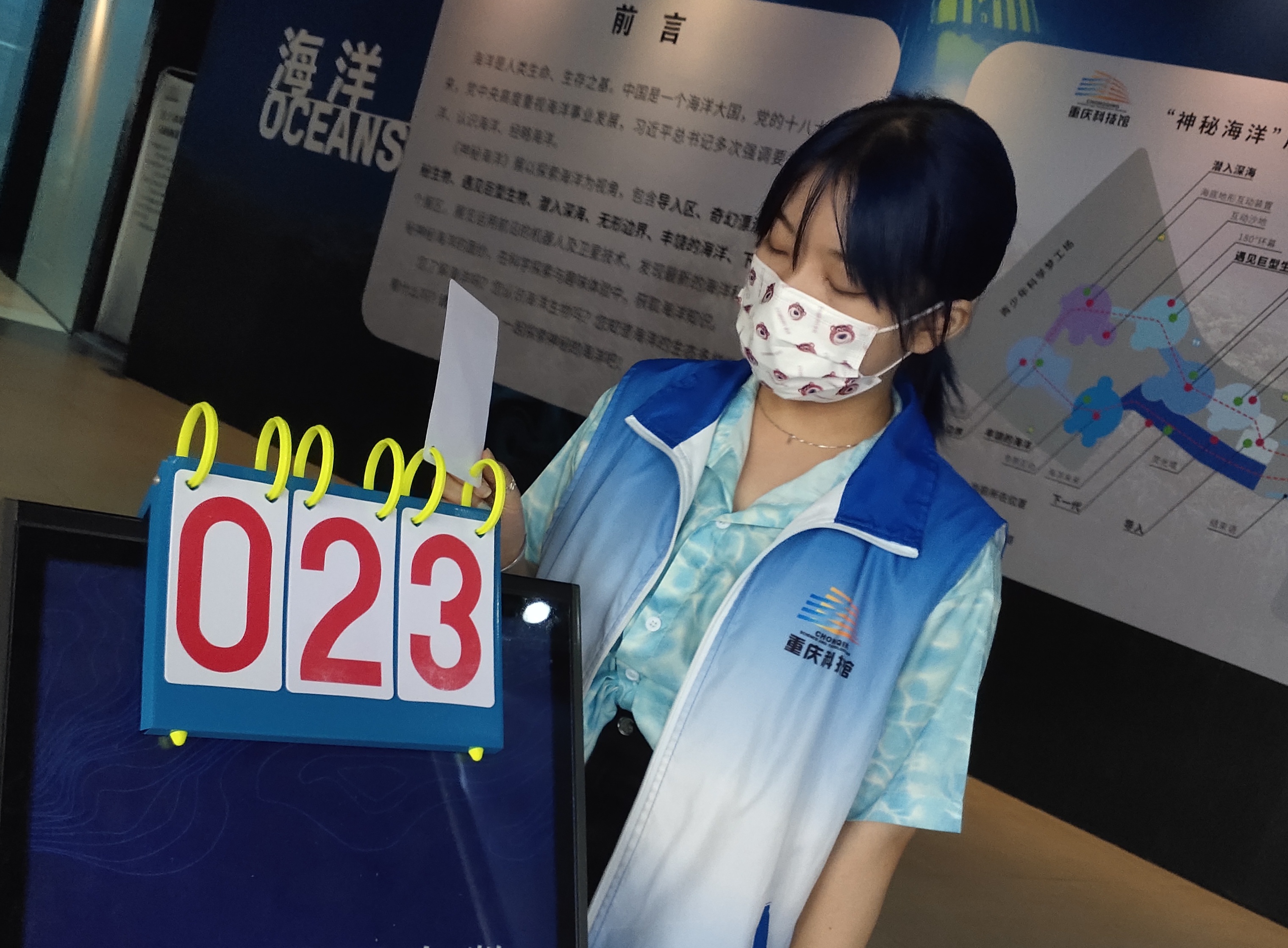 志愿者刘星蕊的任务是在门口出进行人数限制,因为是刚开学的原因,来看展的游客不多,但是她也没有丝毫懈怠,认真站在岗位,完成工作,她说:“在这次志愿活动中体会到了安保人员的辛苦,也学到了不少深海知识。”